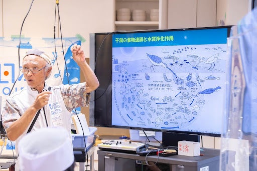 東京湾の干潟は三番瀬と播州干潟を除き埋め立てられてしまったことや、豊富な河川からの流入による汽水域が豊富な生態系を支え、今日食べた海苔・貝・魚が生活することにより、10㎢あたりの干潟で13万人分の有機物、200万人分の窒素を処理する能力があることを話しました。