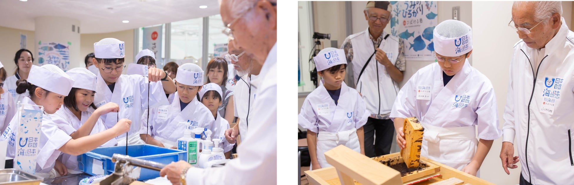 そんな貴重な海苔のすき体験も実施。漁獲量が本当に少なく、今回はたまたま手に入ったという海苔。子どもたちは普段食べる海苔の作り方を体験し、すかれる前の海苔の香りや形を見て改めて普段食べている海苔が海藻であることを実感し、驚きながらも楽しんでいる様子でした。