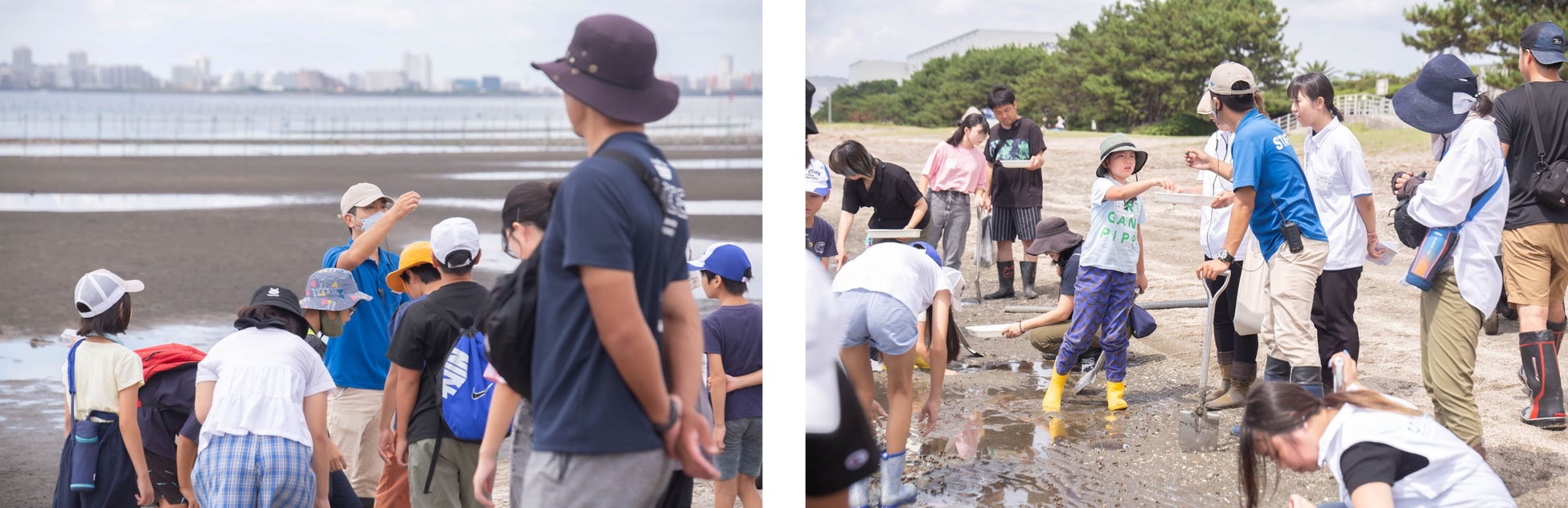 干潟に降りた子どもたちが、スコップで干潟を掘ってみるとたくさんのコメツキガニが。小澤さんの指導のもと、ひっくり返したり触ってみたりしてカニの生態を学びました。その後、ヤドカリの群生地や干潟の役割も学んだ子どもたち。干潟で多くの生物に見て、触れてたくさんのことを学びました。